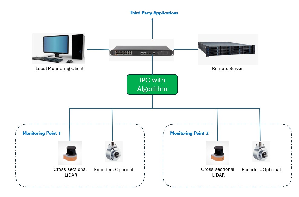 LiDAR conveyor monitoring systems use 2D or 3D laser sensors to scan materials on a conveyor belt, creating a real-time cross-sectional profile. By integrating live conveyor speed data from an encoder, an industrial computer (IPC) calculates the volumetric flow rate. The system can also compare data from the conveyor’s input and output points. This enables it to identify critical issues like flow deviations, jamming, and other potential faults in real-time, enhancing both operational efficiency and safety.